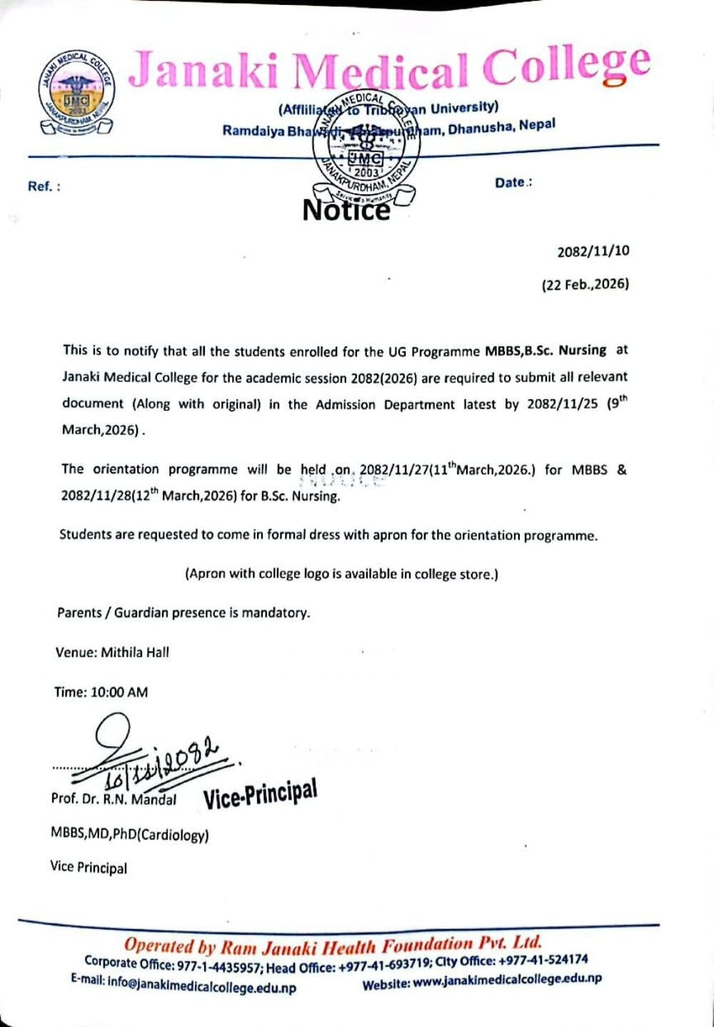 Janaki Medical College (JMC) situated in Janakpur, Dhanusha, Nepal has been an initiative of Ram Janaki Health Foundation Pvt. Ltd to provide health education and healthcare services through its competent professionals in medical academia.